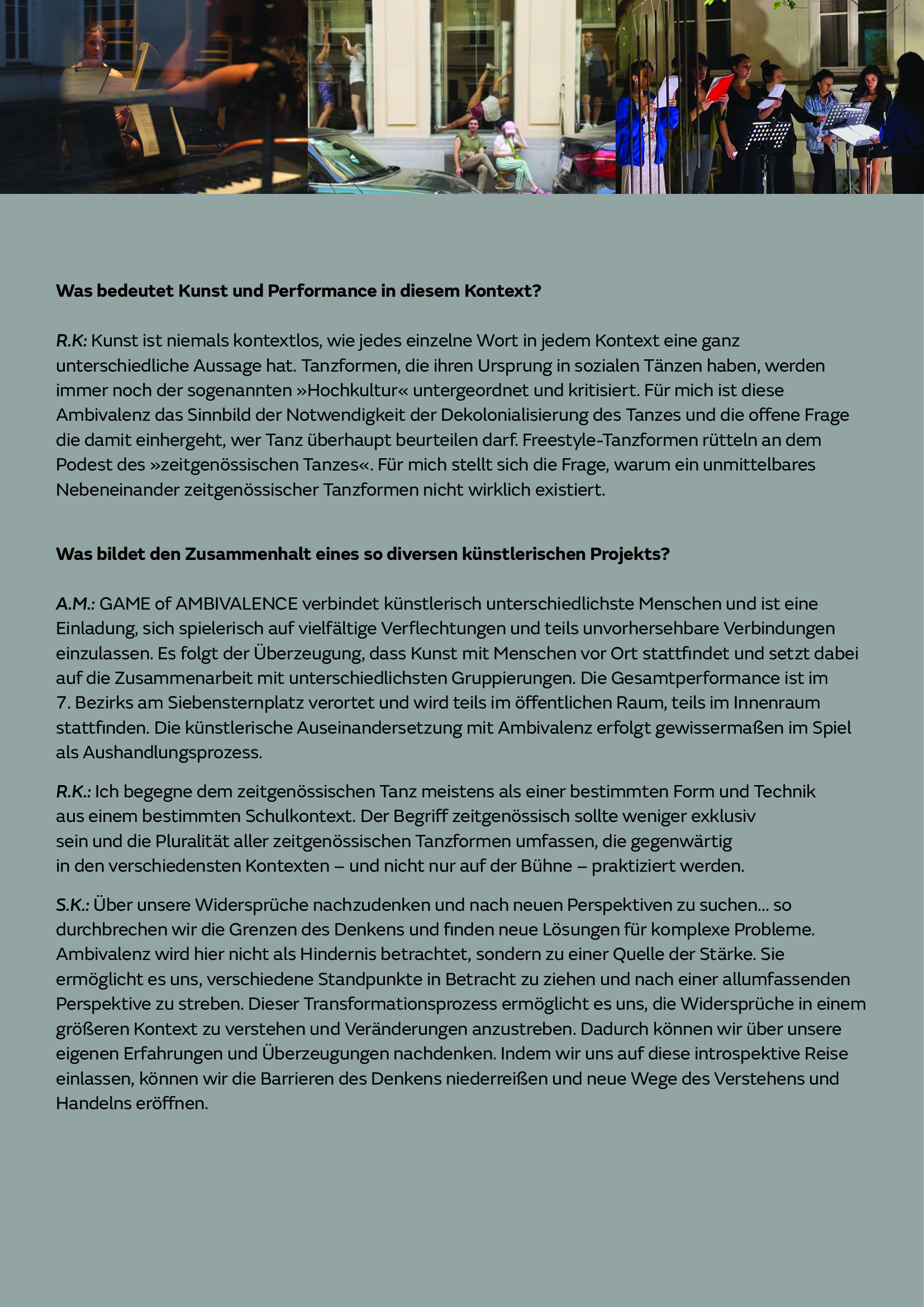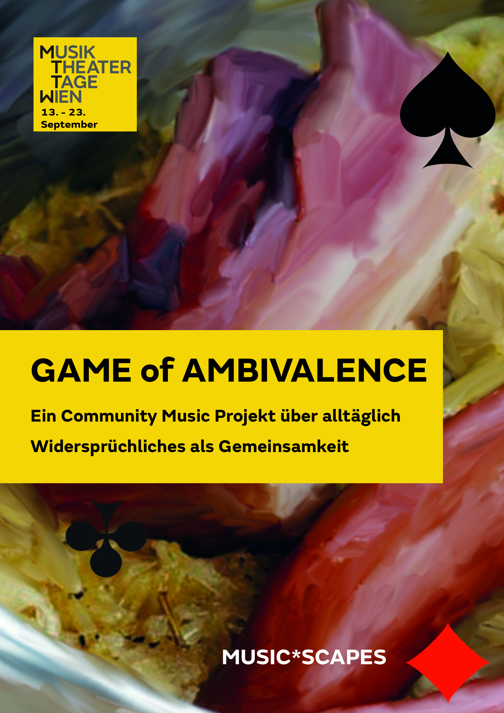 Das partizipative, transkulturelle Projekt GAME OF AMBIVALENCE verortet sich an der Schnittstelle von Community Music und zeitgenössischem Musiktheater. Ambivalentes wird künstlerisch verhandelt: Wie wird vermeintlich Widersprüchliches als Gemeinsamkeit im Alltag von Menschen unterschiedlicher kultureller Gewohnheiten und sozialer Normierungen gelebt? Künstler*innen entwickeln in Zusammenarbeit mit Menschen unterschiedlicher Zugehörigkeiten und Diaspora Communities in verschiedenen Labs eine Performance.