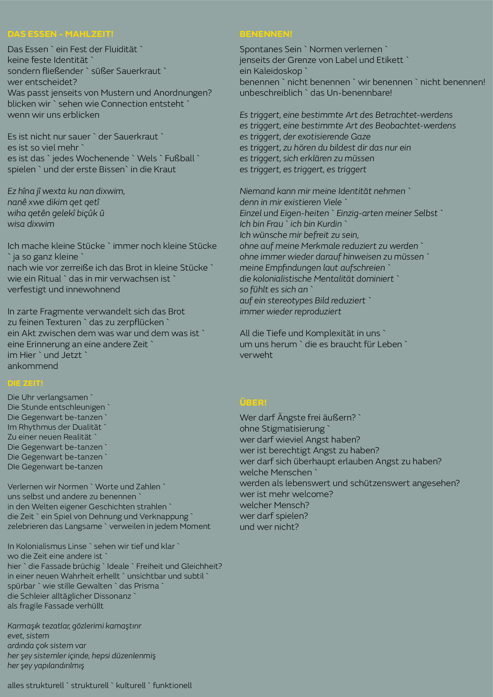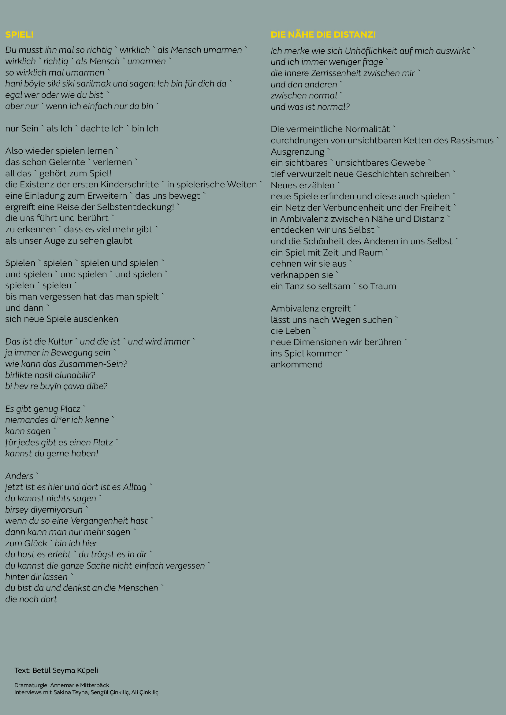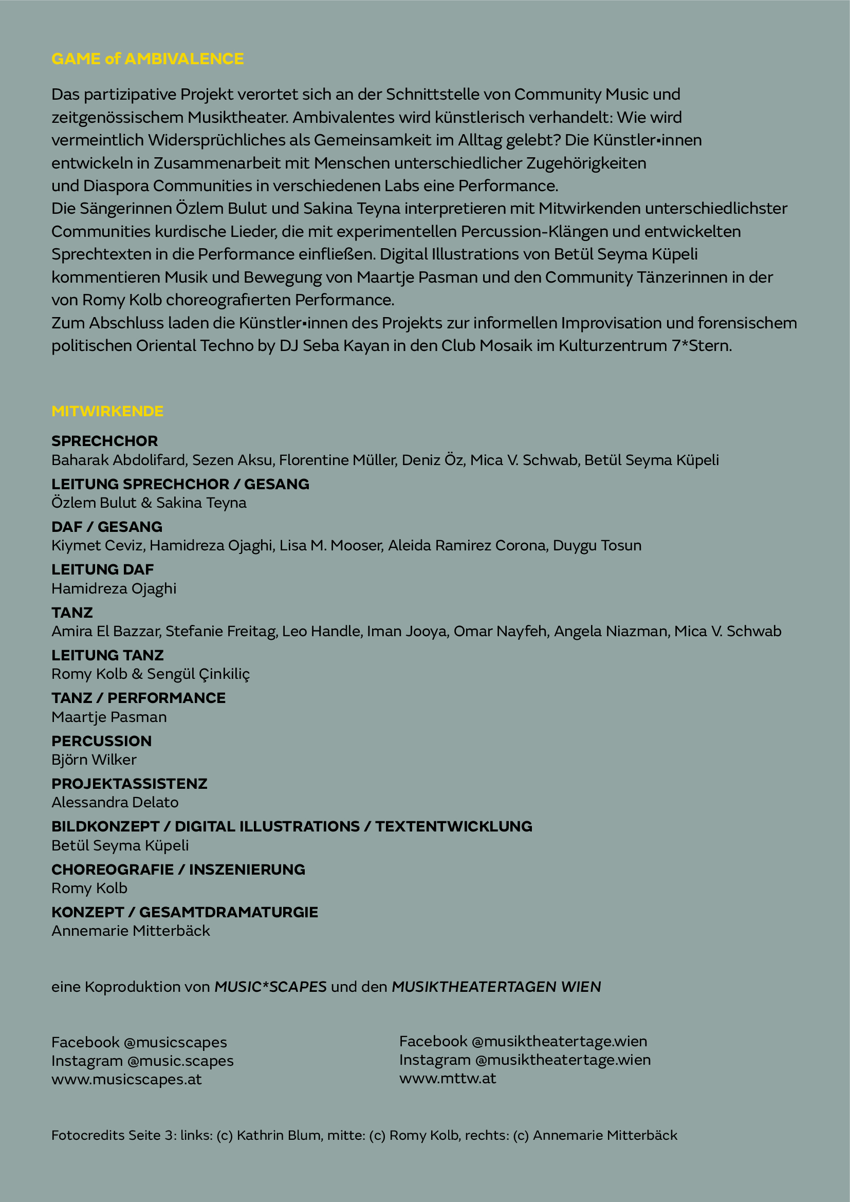 Leitung Gesangs Lab, Gesang: Özlem Bulut & Sakina Teyna Leitung Percussion Lab, Daf: Hamidreza Ojaghi & Björn Wilker Leitung Tanz Lab: Romy Kolb & Sengül Çinkiliç Tanz, Improvisation: Maartje Pasman Bildkonzept, Digital Illustrations, Textentwicklung: Betül Seyma Küpeli Choreografie, Inszenierung: Romy Kolb Konzept, Gesamtdramaturgie: Annemarie Mitterbäck